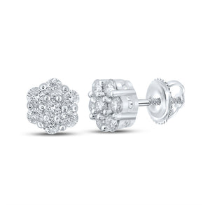 10kt White Gold Mens Round Diamond Flower Cluster Earrings 1/4 Cttw