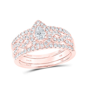 14kt Rose Gold Pear Diamond 3-Piece Bridal Wedding Ring Band Set 7/8 Cttw